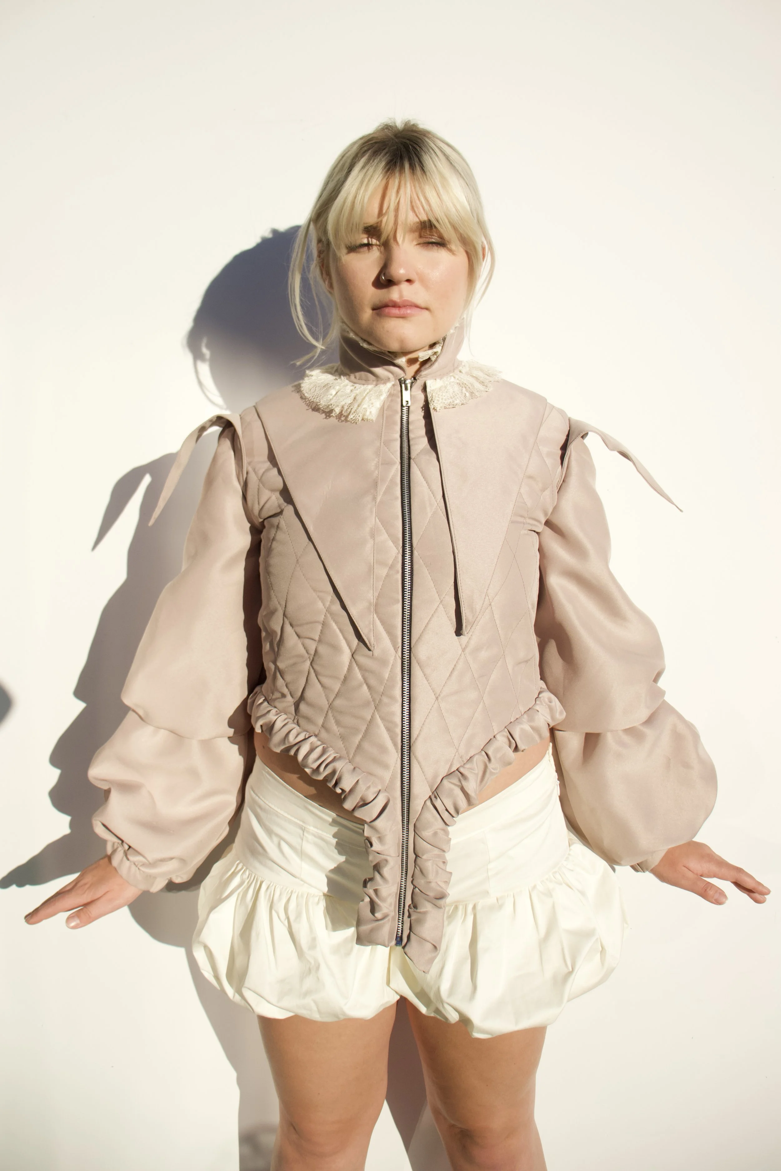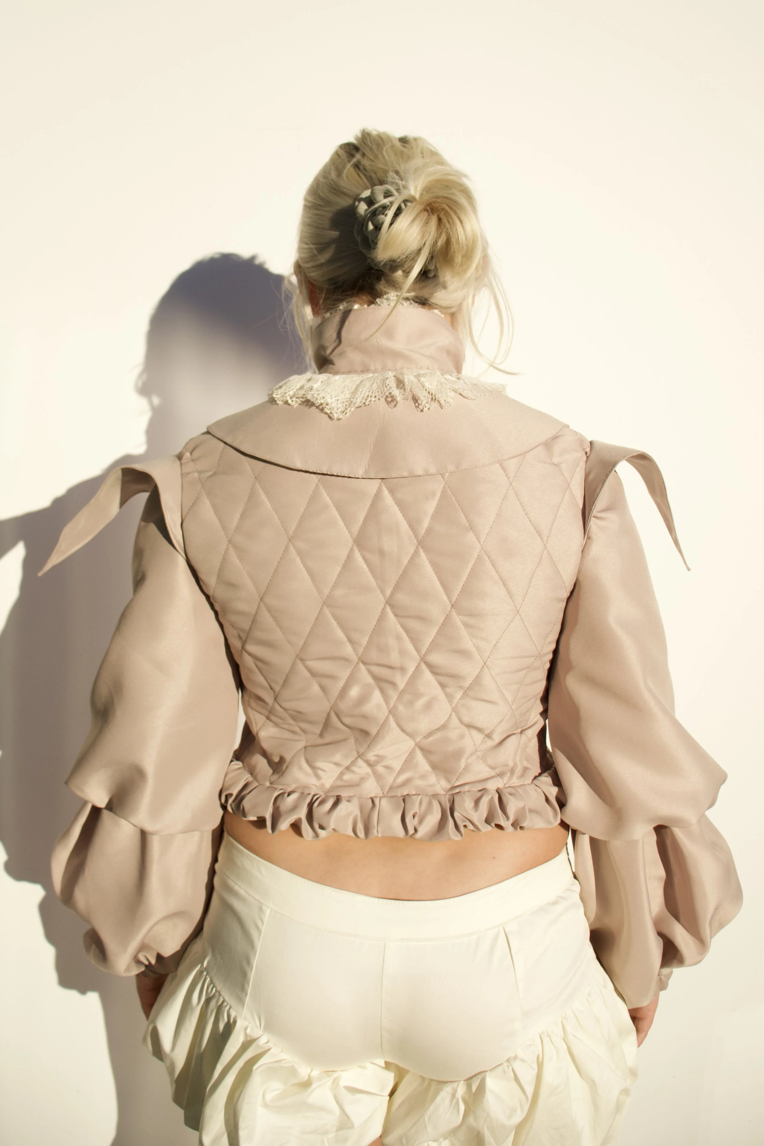 Architectural apparel inspired by gothic Catholic cathedrals. Features a doublet inspired jacket with three collars, a handquilted bodice, and tiered bishop sleeves. The jacket’s bubble hem echoes the bloomer legs.