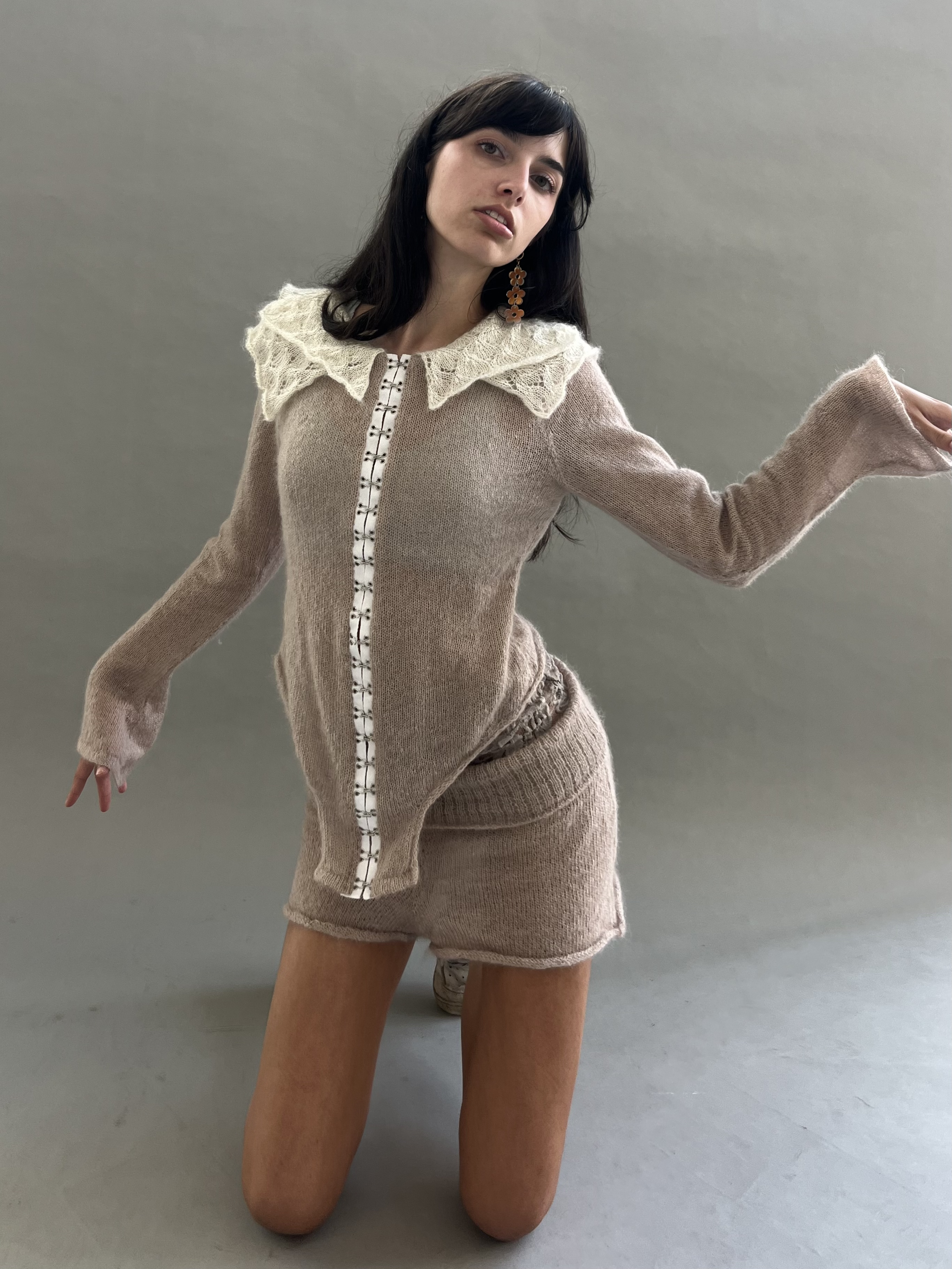 Machine knit cardigan with basque waist interpretation, loose knit and hand manipulated lace