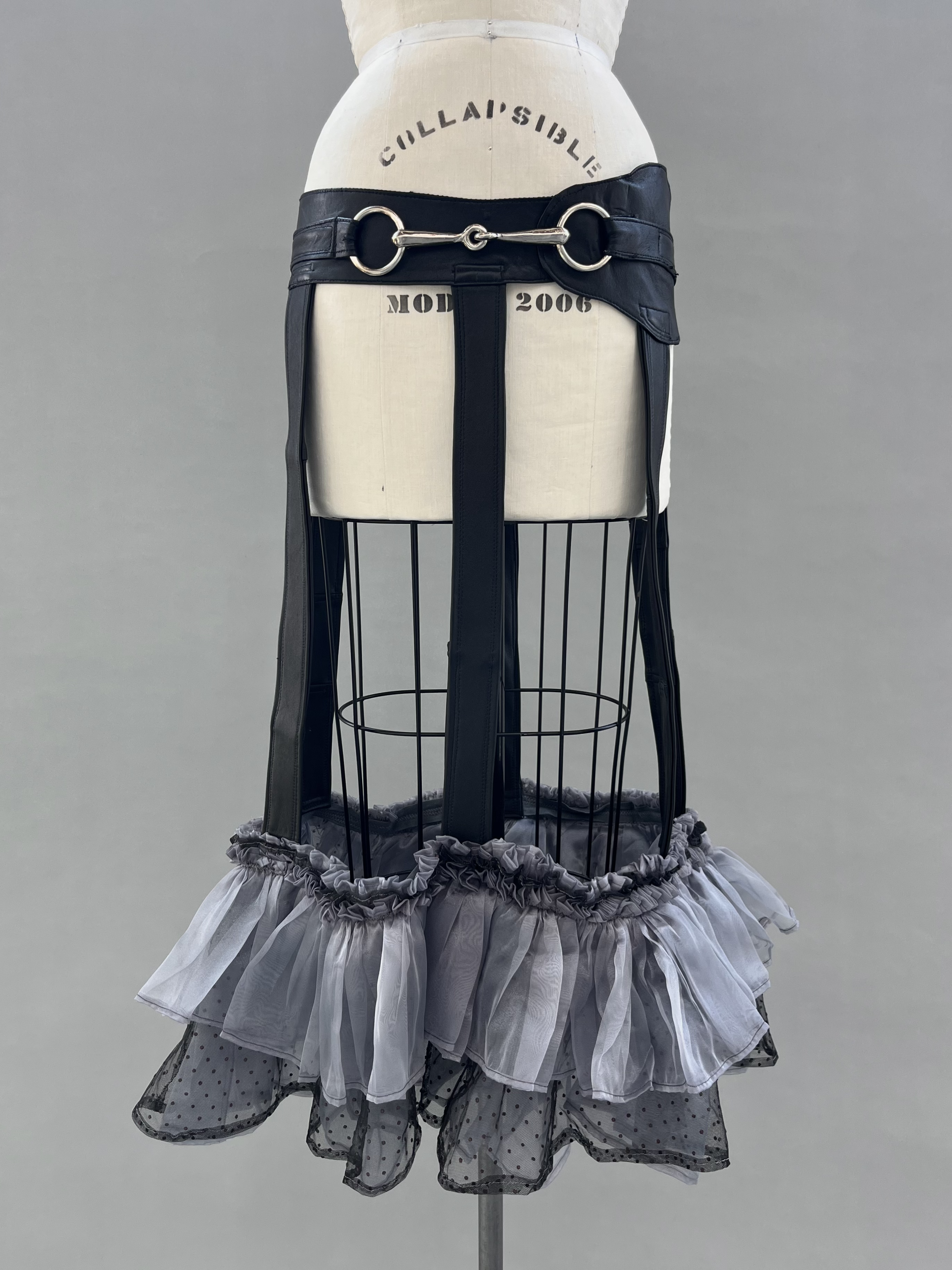 Disjointed and hanging by a string, delicate tulle and organza juxtaposed with sturdy leather and silver horse bit