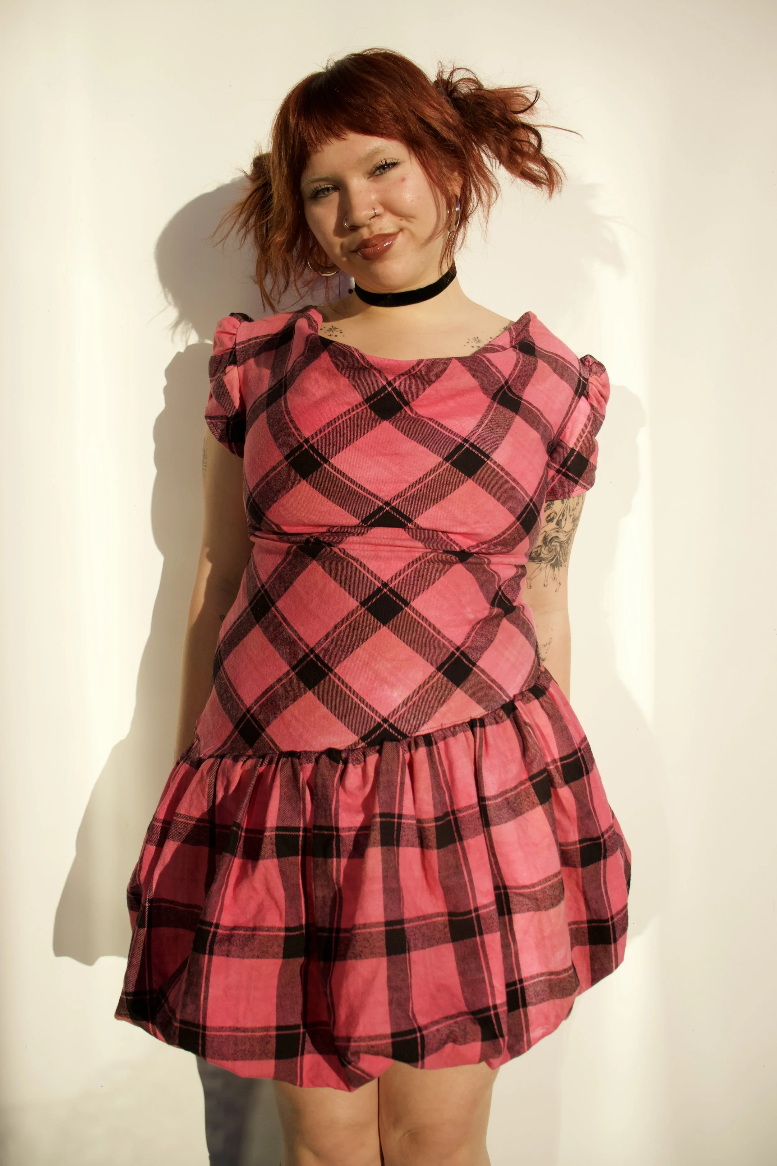Obsessive lace up denim top with plaid pleated skirt made from upcycled materials